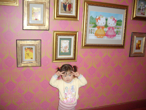 キティーズハウスは家具とかがキティちゃんの形をしていて、かわいかったです。出口でキティちゃんと写真を撮ることができます。無理やりパパを誘って、家族3人で撮ってみました。