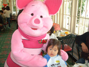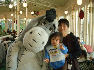 9:00すぎに入園!本日の予定であります「クリスタルパレスのキャラクターズブレックファースト」へダッシューーー。このレストランでは、朝食をとりながら、プーさんなどのキャラクターとコミュニケーションができるのです。朝食は、ミッキーマウスの絵が入ったホットケーキ。サラダ。ポテト、スクランブルエッグ。フルーツ。コーヒー。で、ホテルの朝食メニューって感じです。