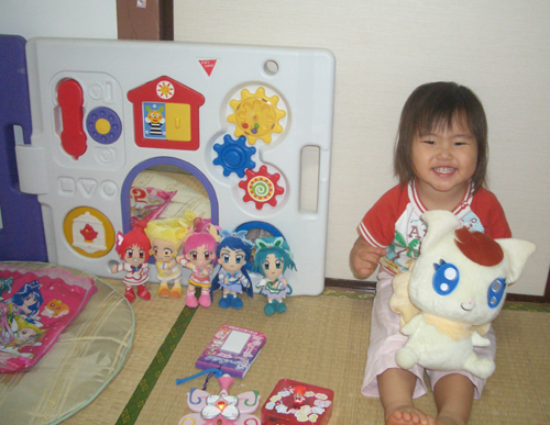 我が家にはUFOキャッチャーでGETしたプリキュアグッズがたくさんあります。まず、人形6体(プリキュアたち5人とココ1匹)、キュアルージュの蓋付入れ物、シール(30枚)、絵本、ポスターなどなど。どんどん増えてます。ポポはお気に入りのココと登園しているのですが、結構大きなお人形なので、毎朝大変です。(^。^;;