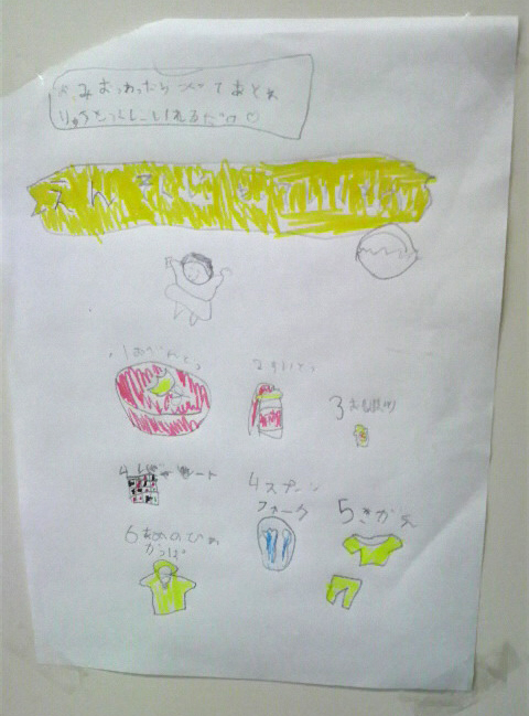 ↓POPOが遠足の時の持ち物を絵入りでかいてくれました。
